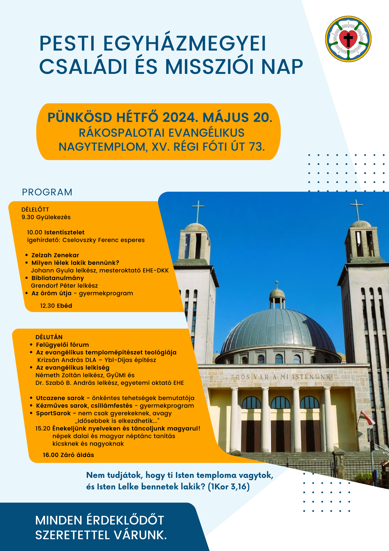 Ezúton szeretnénk értesíteni minden érdeklődőt, hogy a Pesti Egyházmegye családi napjára Pünkösd hétfőn kerül sor, ezen a napon templomunkban nem lesz istentisztelet. Helyszín: Rákospalotai Evangélikus Nagytemplom Cím: XV. ker.Régi Fóti … [Read more…]