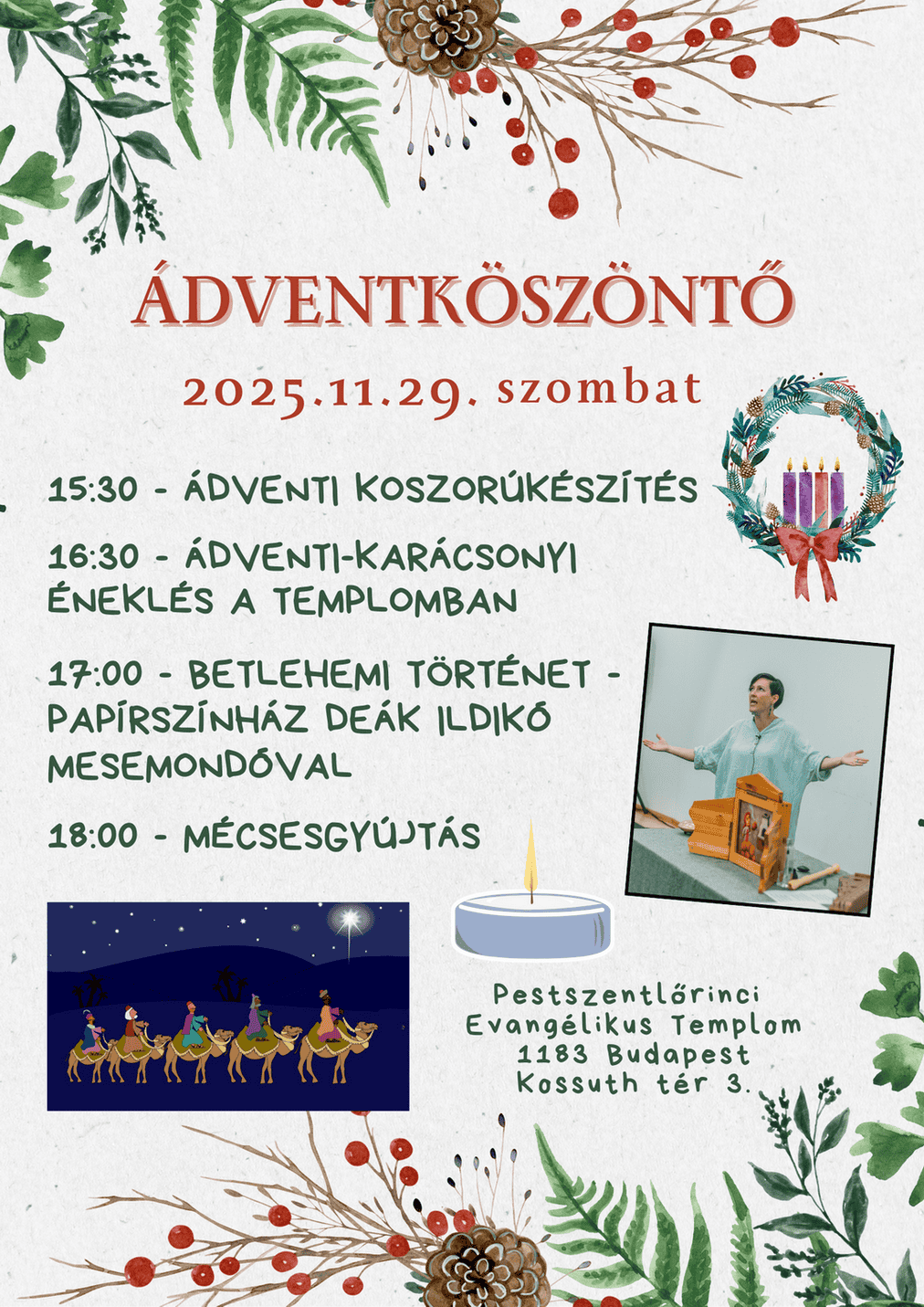 Szombaton (2025. nov. 29.) 15.30-kor kezdődik hagyományos ádventköszöntő délutánunk. Az első órában családi és egyéni koszorúkészítéssel, majd 16.30-kor az ádvent és karácsony hangulatát megszólaltató templomi énekléssel, 17 órakor pedig a … [Read more…]