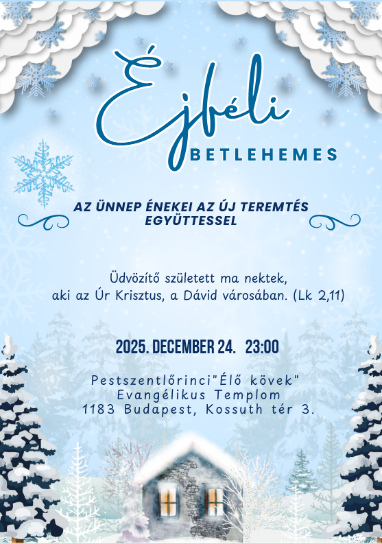 Az Új Teremtés zenei szolgálatával „fűszerezve” tartjuk az éjféli betlehemes igehirdetésünket ( a Megváltó születését várjuk ) december 24-én templomunkban. Figyelem az esemény este 11 órakor kezdődik. Mindenkit várunk szeretettel … [Read more…]
