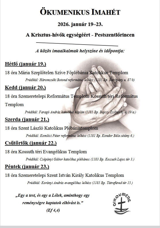 Kedves Testvérek ! Jövő héten kezdődik az Ökumenikus imahét,melynek keretében a mi templomunkban a találkozó csütörtökön (január 22-én) 18:00-kor kezdődik. Mivel mind az 5 alkalom a kerületben lesz kérjük a … [Read more…]