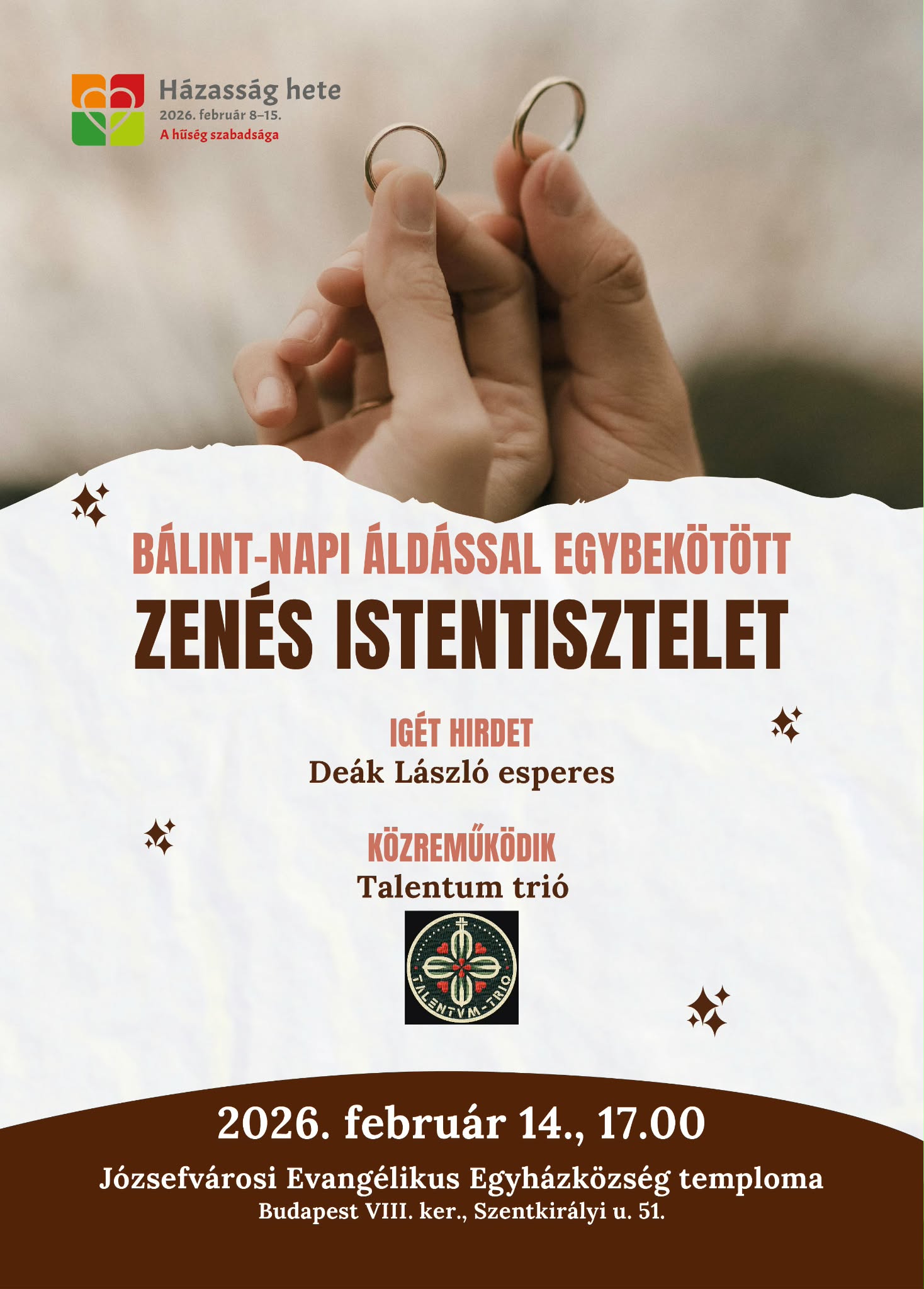 Egyházmegyei szervezésben kerül sor a héten szombaton (Bálint napi áldással) egy zenés istentiszteletre a Házasság heti programok keretében. Várunk és hívunk minden testvérünket egyházon belül és kívül. Helyszín:Józsefvárosi Evangélikus Templom … [Read more…]