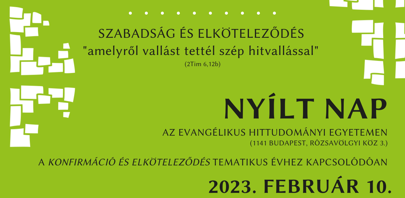 Az Evangélikus Hittudományi Egyetem nyílt napon szervez 2023. február 10-én a „Konfirmáció és elköteleződés” tematikus évéhez kapcsolódóan.Kezdés reggel 9-kor, jelentkezni a tanulmányi.teol@lutheran.hu címen lehet. Téged is várunk az eseményen, hozd … [Read more…]